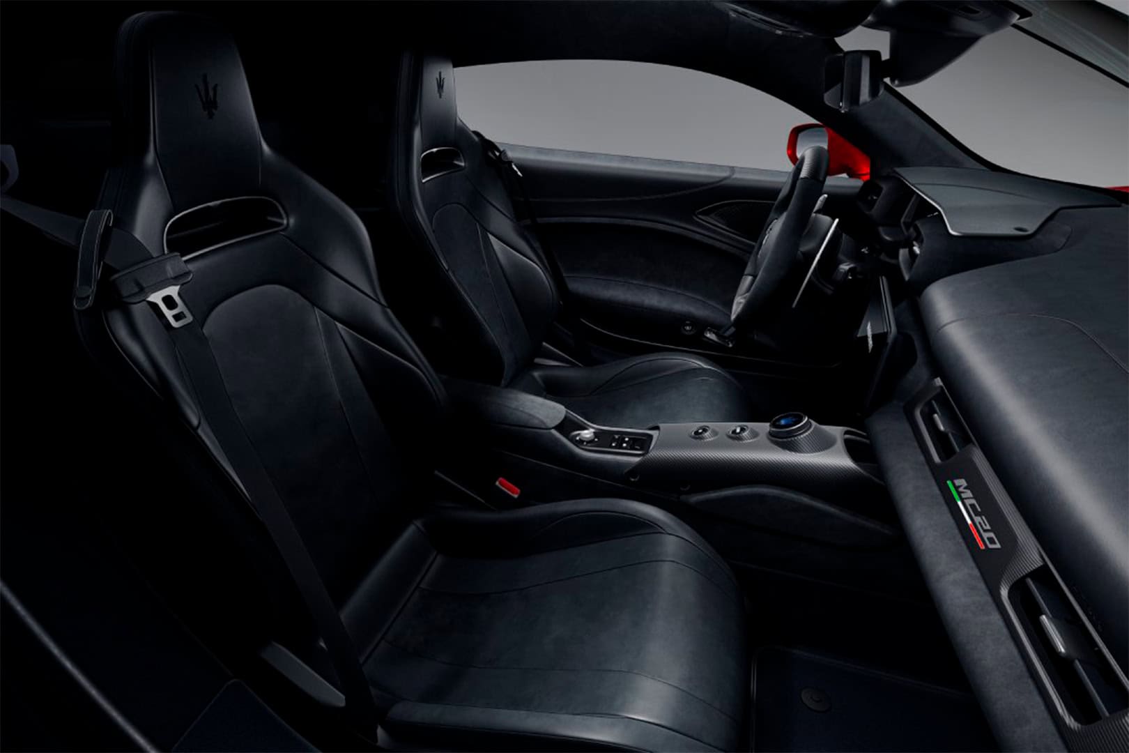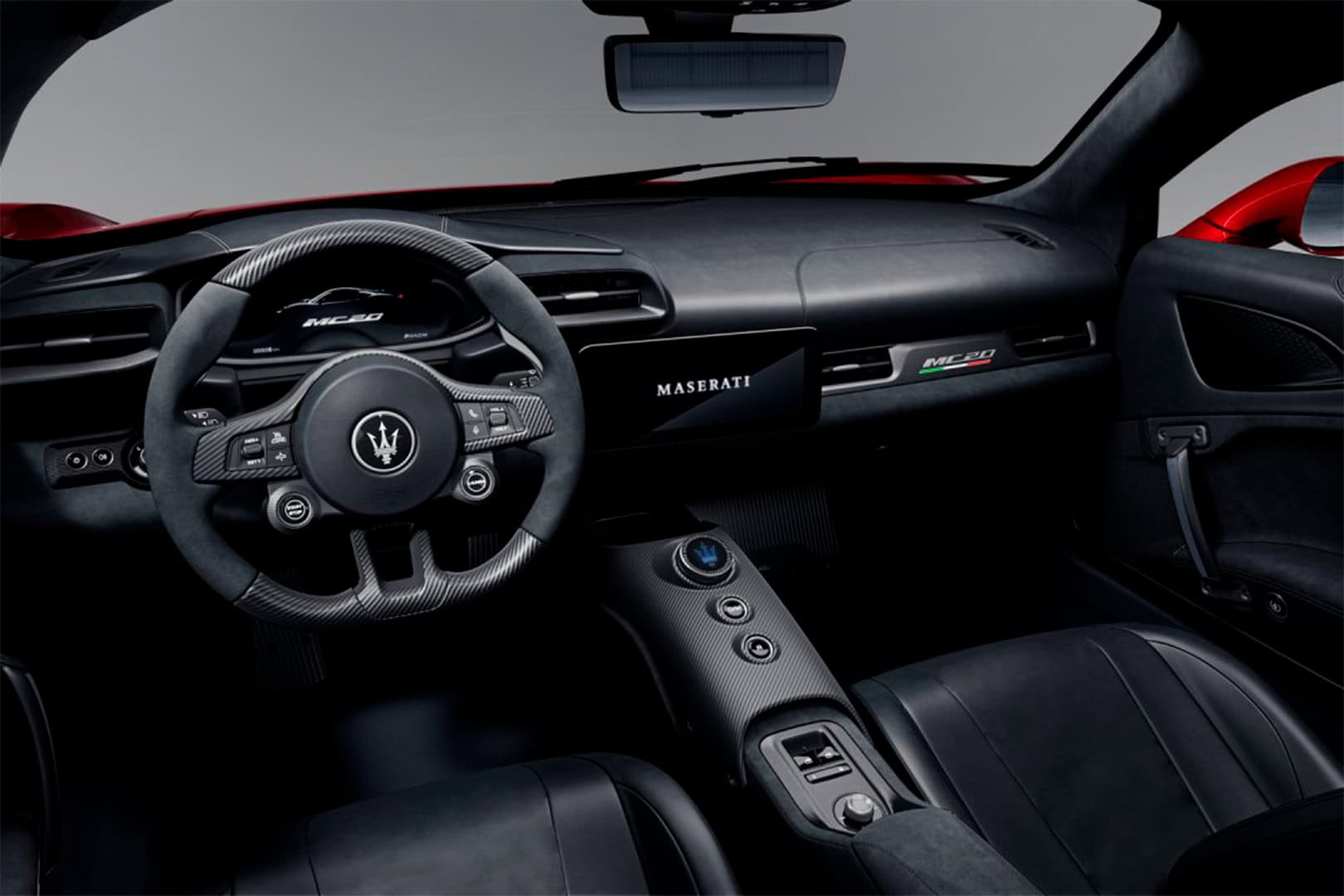 Los materiales de alto rendimiento, como la fibra de carbono tridimensional expuesta y el cuero perforado, se combinan con motivos de chevrón que intensifican el dinamismo del automóvil.